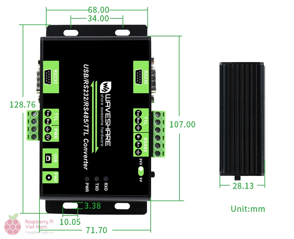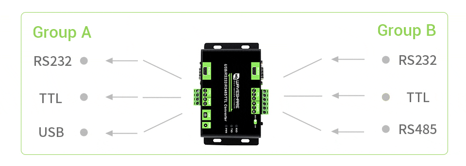 - Hỗ trợ chuyển mức điện áp TTL 3.3V / 5V, cho phép lựa chọn mức điện áp tại cổng TTL Group B