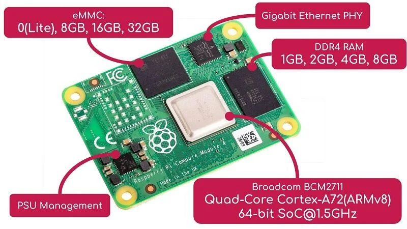 Raspberry Pi Compute Module 4 (CM4) và Compute Module 4 Lite (CM4 Lite) được xây dựn dựa trên Raspberry Pi 4 Model B. Nó được trang bị SoC Broadcom BCM2711 Lõi tứ với xung nhịp hoạt động ở 1.8GHz (có thể ép xung cao hơn – chỉ thích hợp cho người dùng chuyên nghiệp). Trên module, bạn cũng sẽ có chip RAM, chip Ethernet và chip quản lý nguồn điện. Tùy theo phiên bản, bạn sẽ có thêm chip Wireless cũng như eMMC (tùy theo lựa chọn).