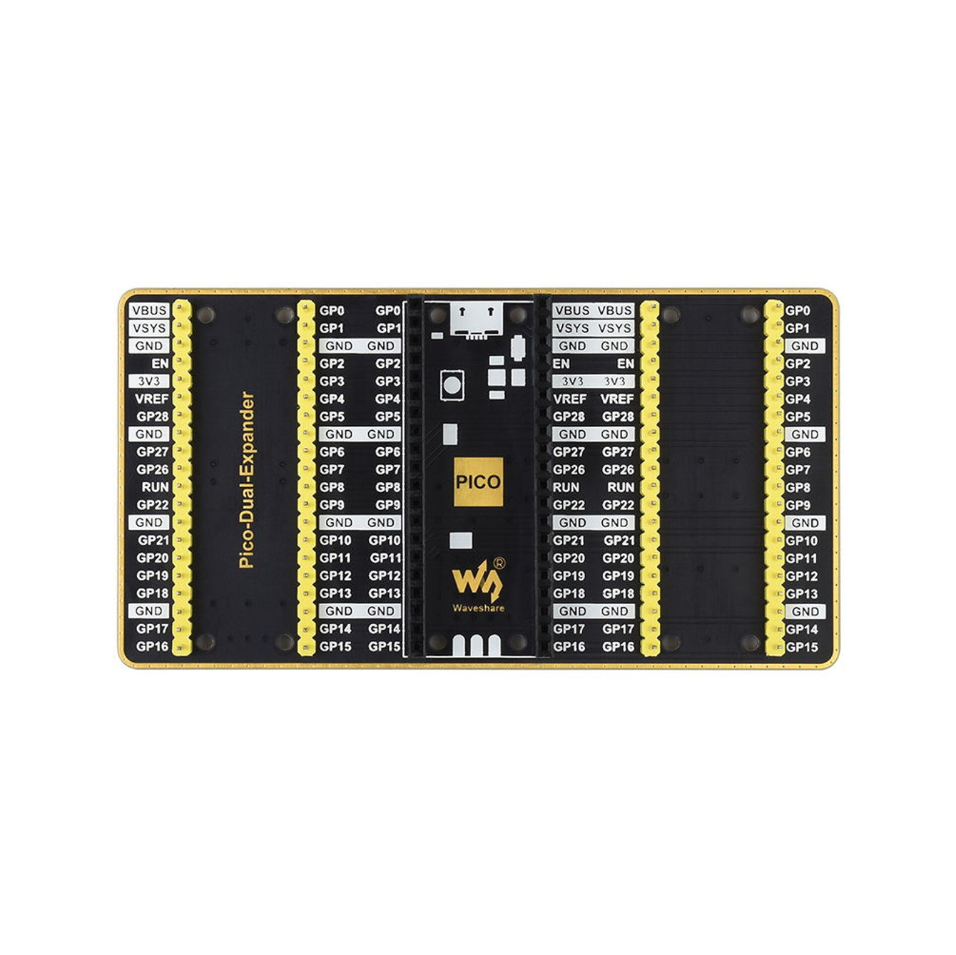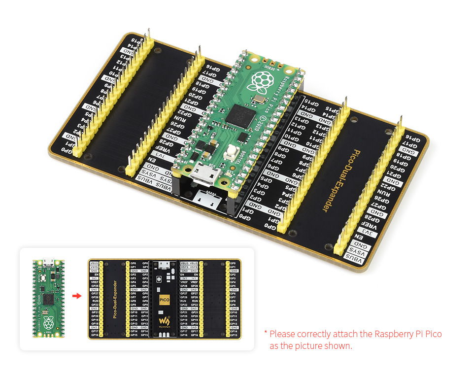- Hai bộ header male (đực) 2×20, cho phép kết nối nhiều mô-đun mở rộng Raspberry Pi Pico hơn