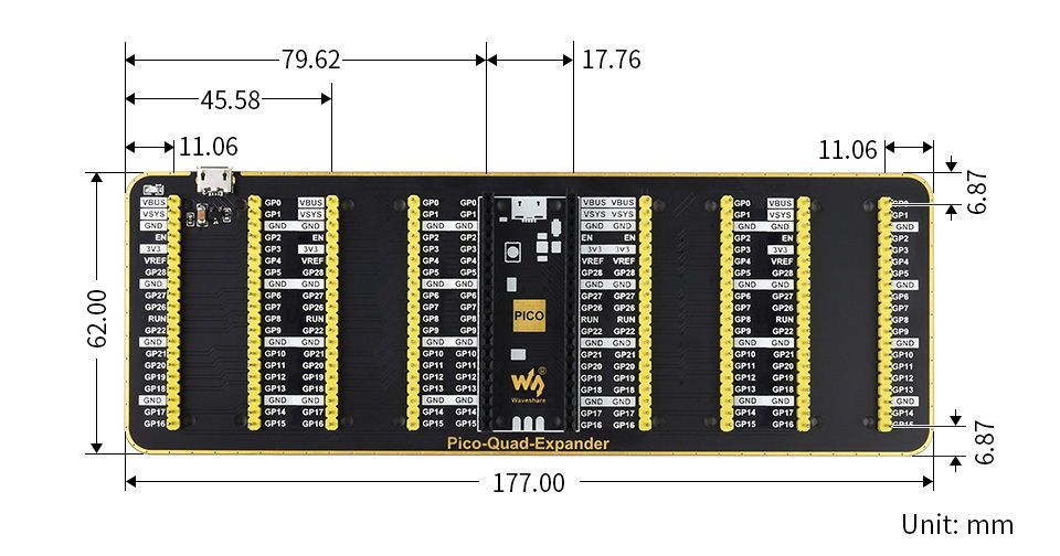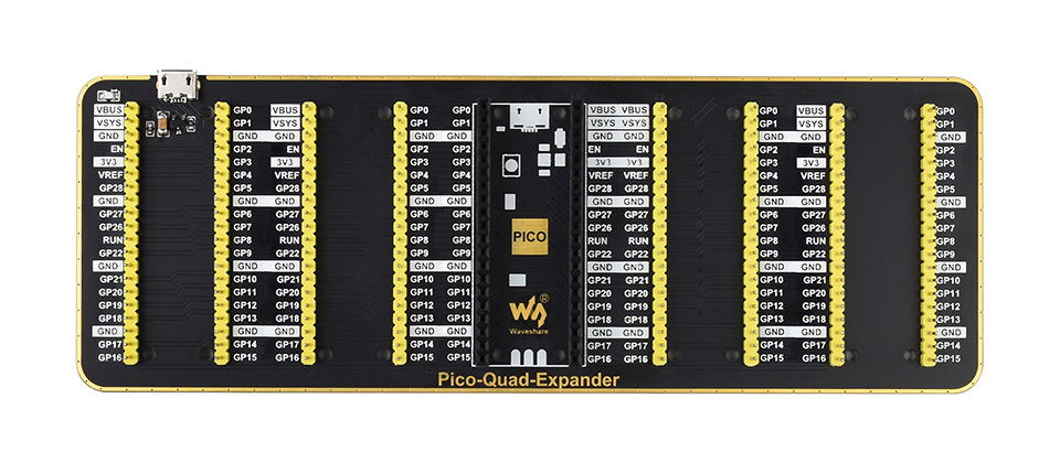 - Bốn bộ header đực 2×20, cho phép kết nối nhiều mô-đun mở rộng Raspberry Pi Pico hơn