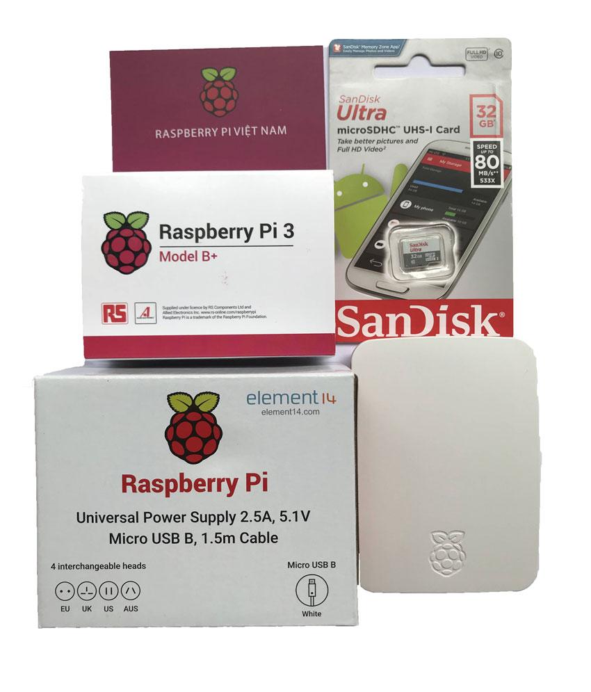 Bộ sản phẩm Raspberry Pi 3 B+ Official là bộ combo mạch Raspberry Pi 3 Model B+ cùng với các phụ kiện của chính hãng, cụ thể gồm: