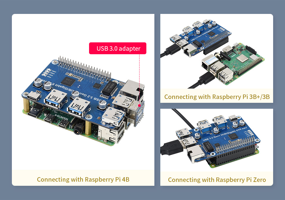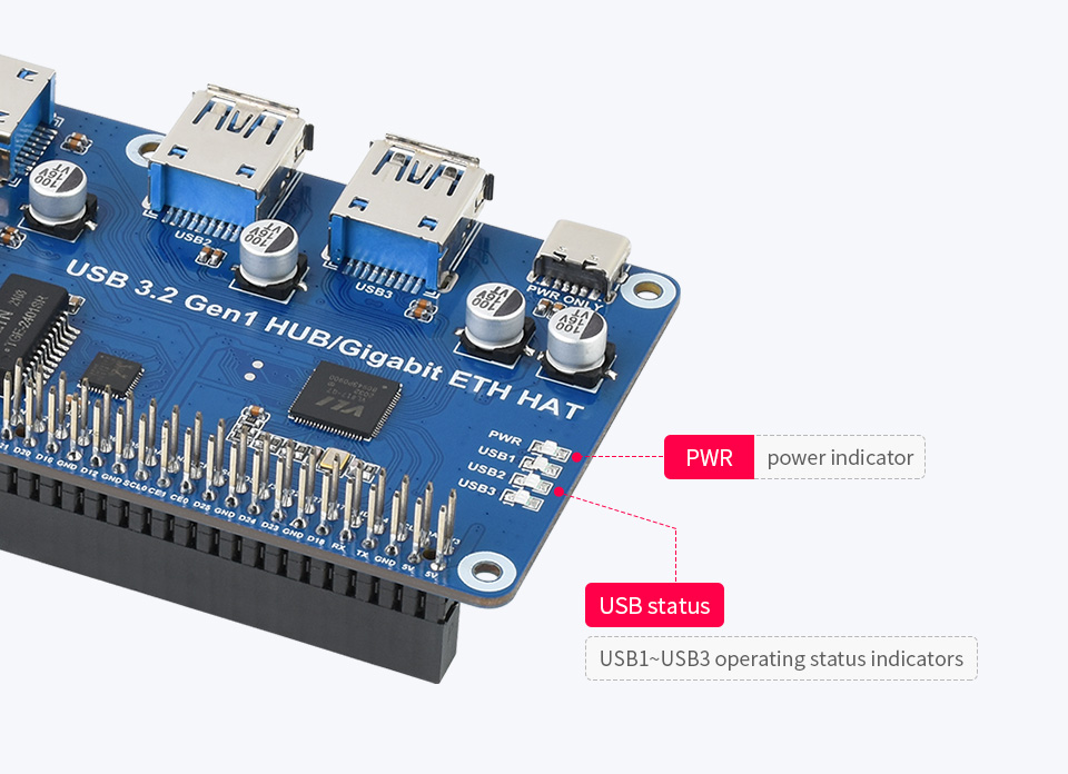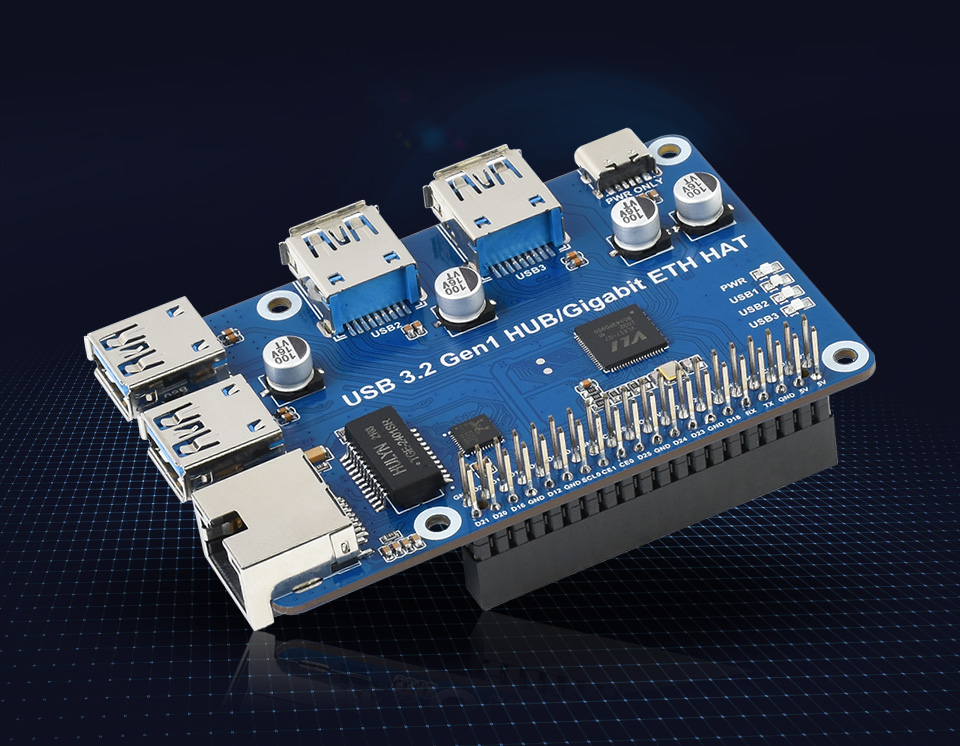 HAT mở rộng 3 cổng USB 3.2 Gen 1 và 1 cổng Ethernet Gigabit tương thích nhiều thiết bị khác như máy tính chạy Windows, Mac, Linux và đặc biệt cả Android mà không cần cài driver. Bạn chỉ cần cắm là sử dụng được luôn.