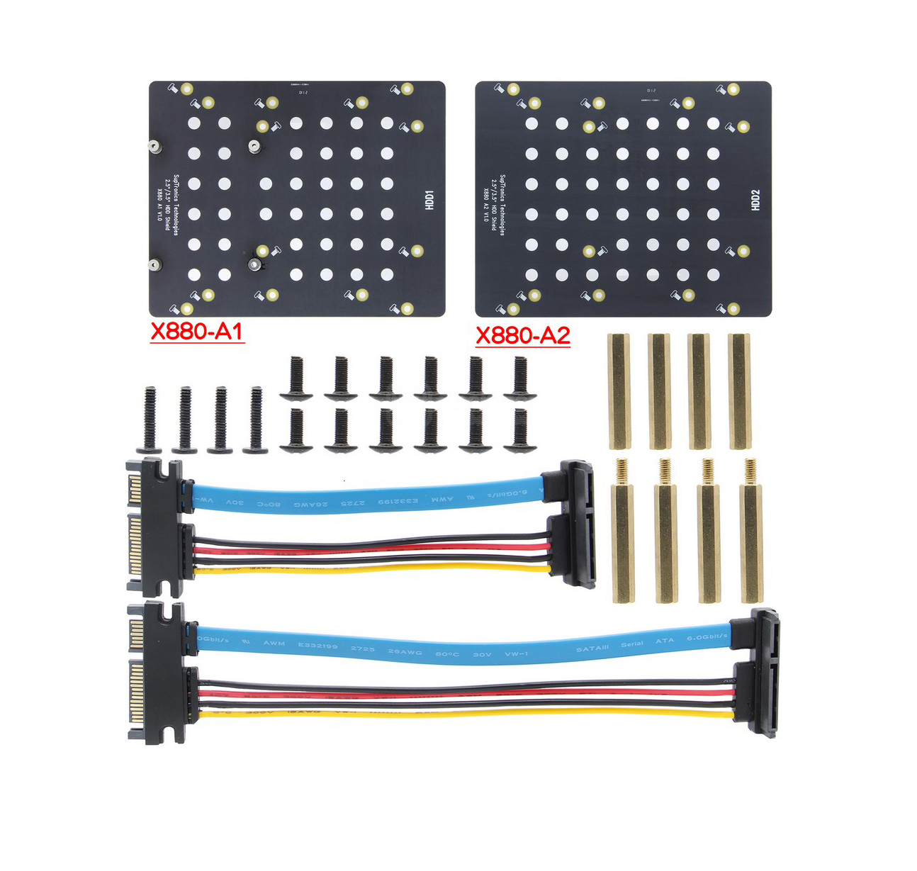 X880-A1 và X880-A2 là hai bảng mạch PCB có lỗ định vị sử dụng để giữ ổ cứng / SSD 2.5 “hoặc 3.5” để sử dụng với bo mạch X880 cùng nhau