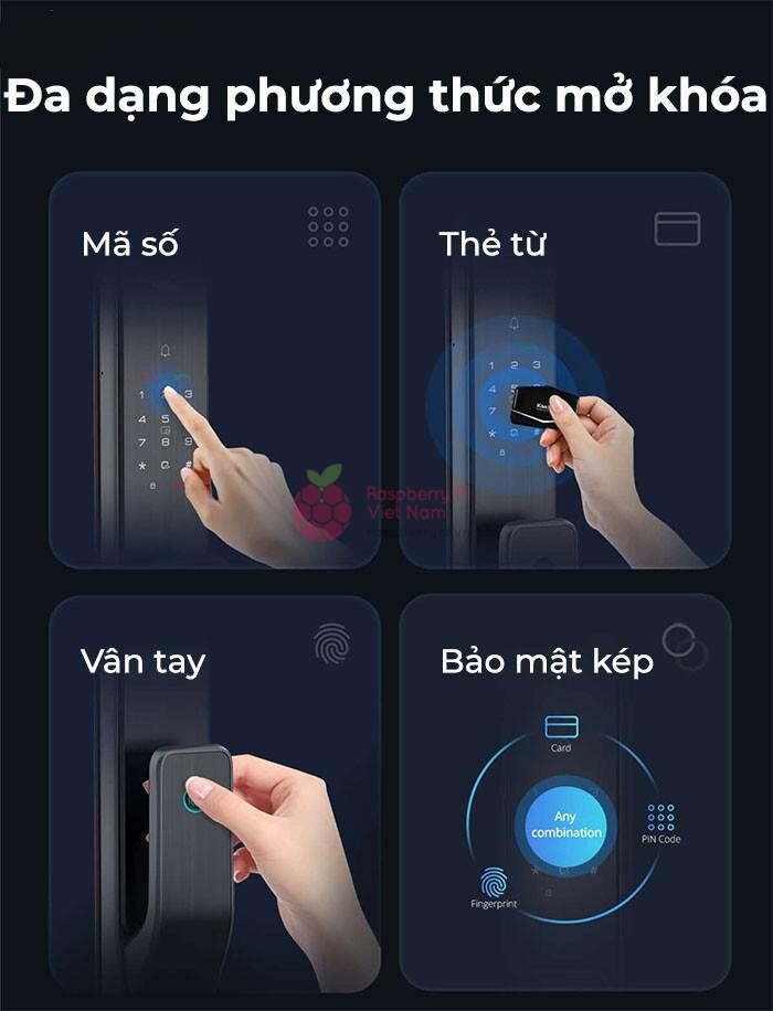 Bảo mật kép: Yêu cầu cùng lúc 2 phương thức mở khoá mới có thể mở cửa. Kích hoạt tuỳ ý, thao tác dễ dàng ngay trên khoá.