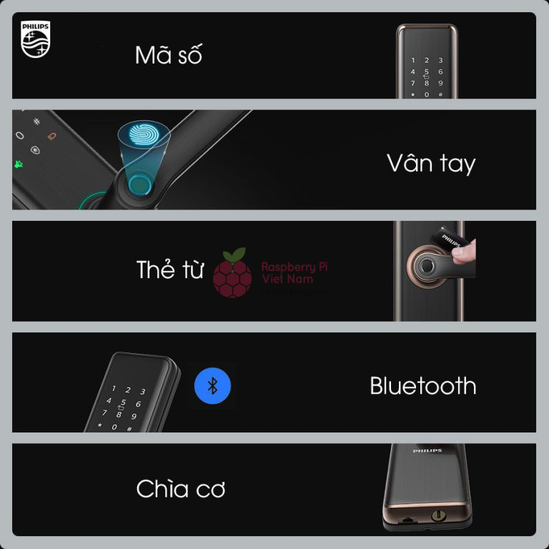 Philips 7300 hiện được trang bị các phương pháp mở khóa cao cấp và quen thuộc hiện nay: Vân tay, mã số, thẻ từ, chìa cơ.