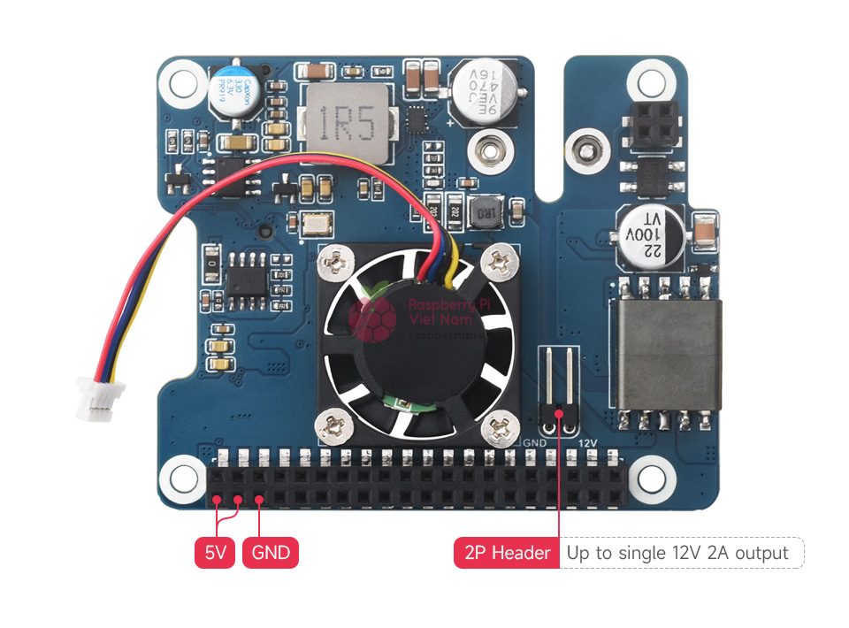 Đầu cắm 5V cung cấp đầu ra lên đến 4.5A (MAX 25W cho tổng công suất đầu ra 12V + 5V), có thể cấp nguồn cho các thiết bị bổ sung trong khi cung cấp năng lượng ổn định cho Raspberry Pi