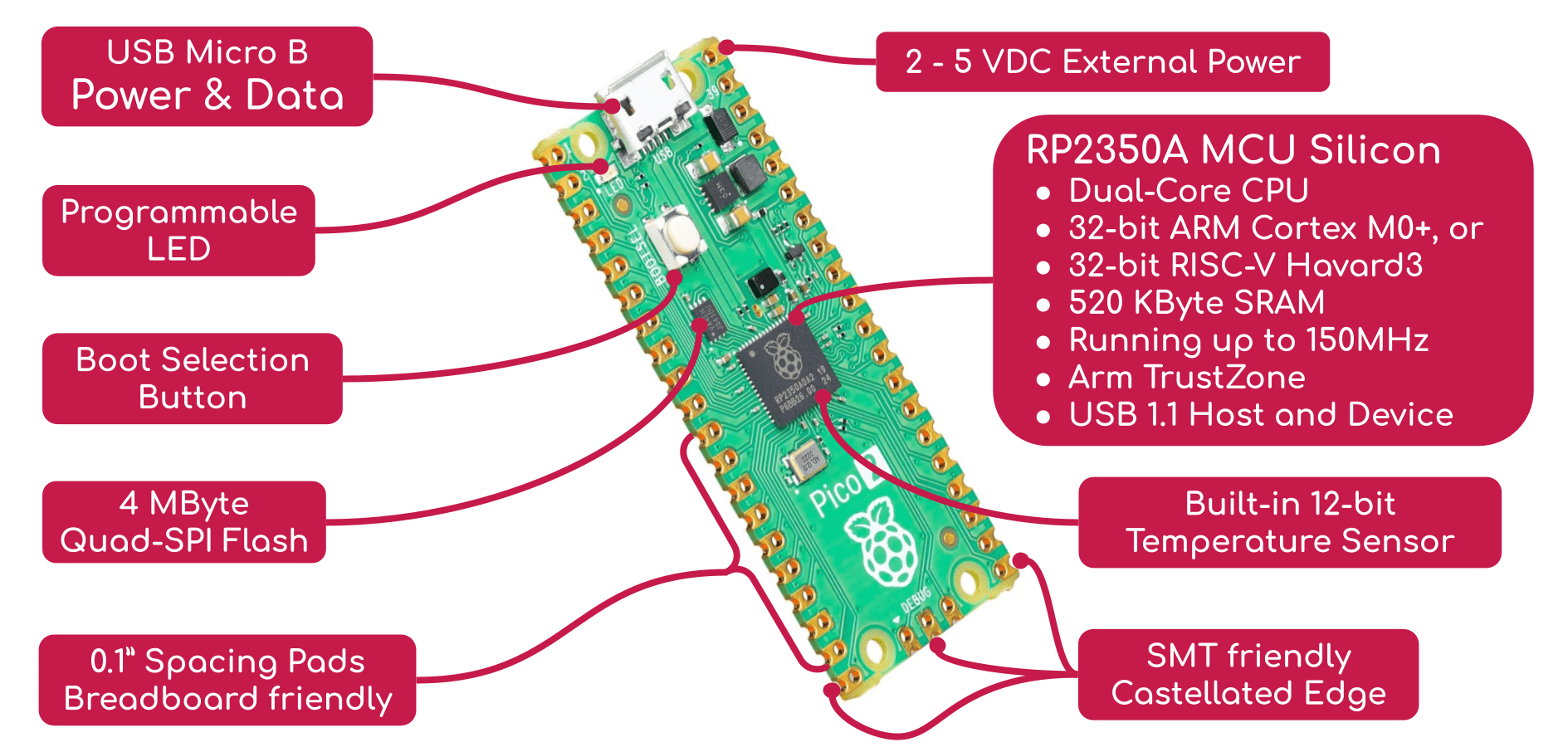 - MCU RP2350A được thiết kế từ đầu bởi các kỹ sư của Nhóm Raspberry Pi