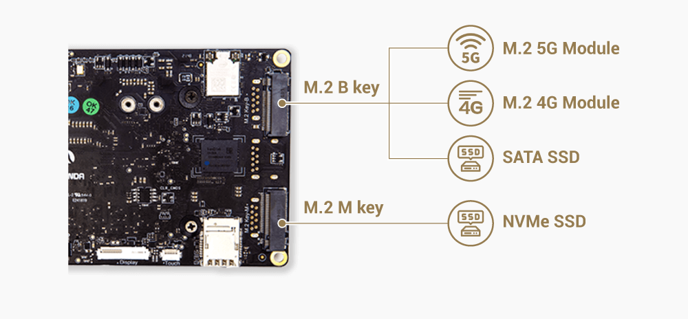 - 1x M.2 B Key, USB 2.0, USB 3.0, SIM, SATA(Option support PCIe 3.0 1x), Supports 4G & 5G module