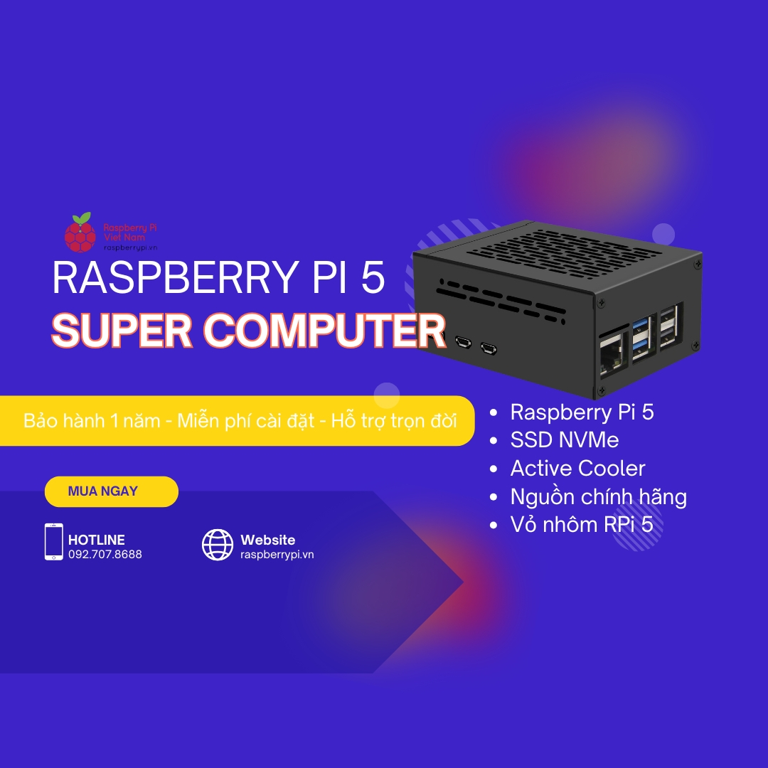 Raspberry Pi Việt Nam xin giới thiệu bộ sản phẩm Raspberry Pi 5 Super Computer Kit được chúng tôi xây dựng với mong muốn đáp ứng tất cả mọi nhu cầu sử dụng cao nhất của Quý khách hàng. Bộ Super Computer Kit sử dụng mạch Raspberry Pi 5 mới nhất với tùy chọn SSD NVMe giúp mang lại hiệu suất tối đa khi sử dụng mà vẫn tiết kiệm điện, nhỏ gọn.