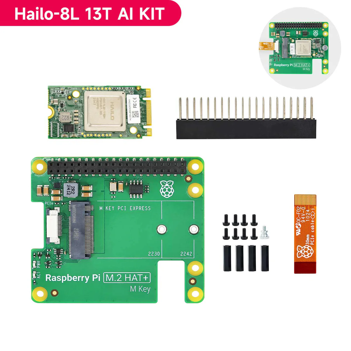 - 1 x Bộ tăng tốc AI HAILO 8L M.2 B+M Key (Đã được lắp đặt sẵn trên M.2 HAT+)