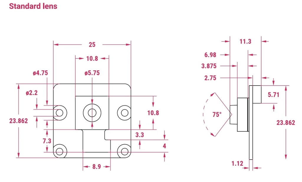 Camera Module V3 có cùng kích thước PCB với Raspberry Pi Camera V1/V2, bao gồm các lỗ gắn vít. Vì vậy bạn có thể dùng chung giá đỡ camera hoặc vỏ. Tuy nhiên, ống kính lấy nét tự động của máy ảnh lớn hơn và cao hơn một chút, điều có thể kiến nó không vừa với một số vỏ/ giá đỡ. Nó đi kèm với một ống kính Tự động lấy nét theo pha (PDAF). Ống kính lấy nét tự động được cấp nguồn và có thể điều khiển bởi Raspberry Pi thông qua cáp FFC 15 chân tiêu chuẩn.