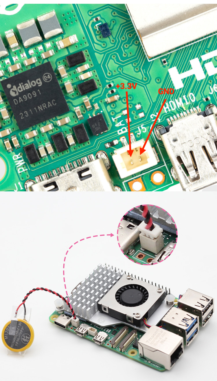 Raspberry Pi 5 đã được bổ sung module RTC – Realtime Clock (đồng hồ thời gian thực) với khe cắm J5 (BAT) có sẵn trên bo mạch. Đối với Raspberry Pi 5, RTC là một phụ kiện giúp duy trì ngày & giờ hiện tại độc lập với CPU. Nó bao gồm một mạch đồng hồ công suất thấp. Bạn có thể cấp nguồn cho mạch này bằng nguồn cung cấp 5V tiêu chuẩn hoặc bằng pin RTC.