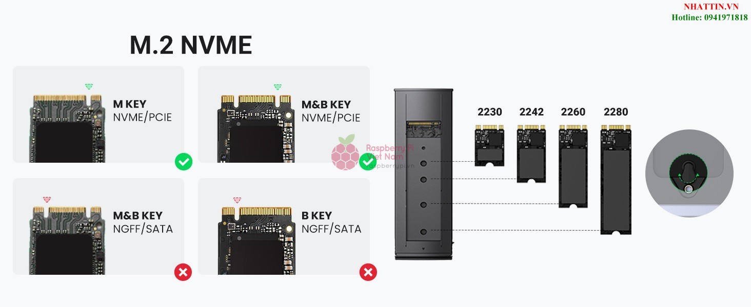 Ugreen 15512 hỗ trợ SSD chuẩn NVMe Key M và B&M với các kích thước phổ biến 2230 / 2242 / 2260 / 2280, dung lượng tối đa 8TB. Tương thích với Windows, macOS, Linux, Android, iOS.