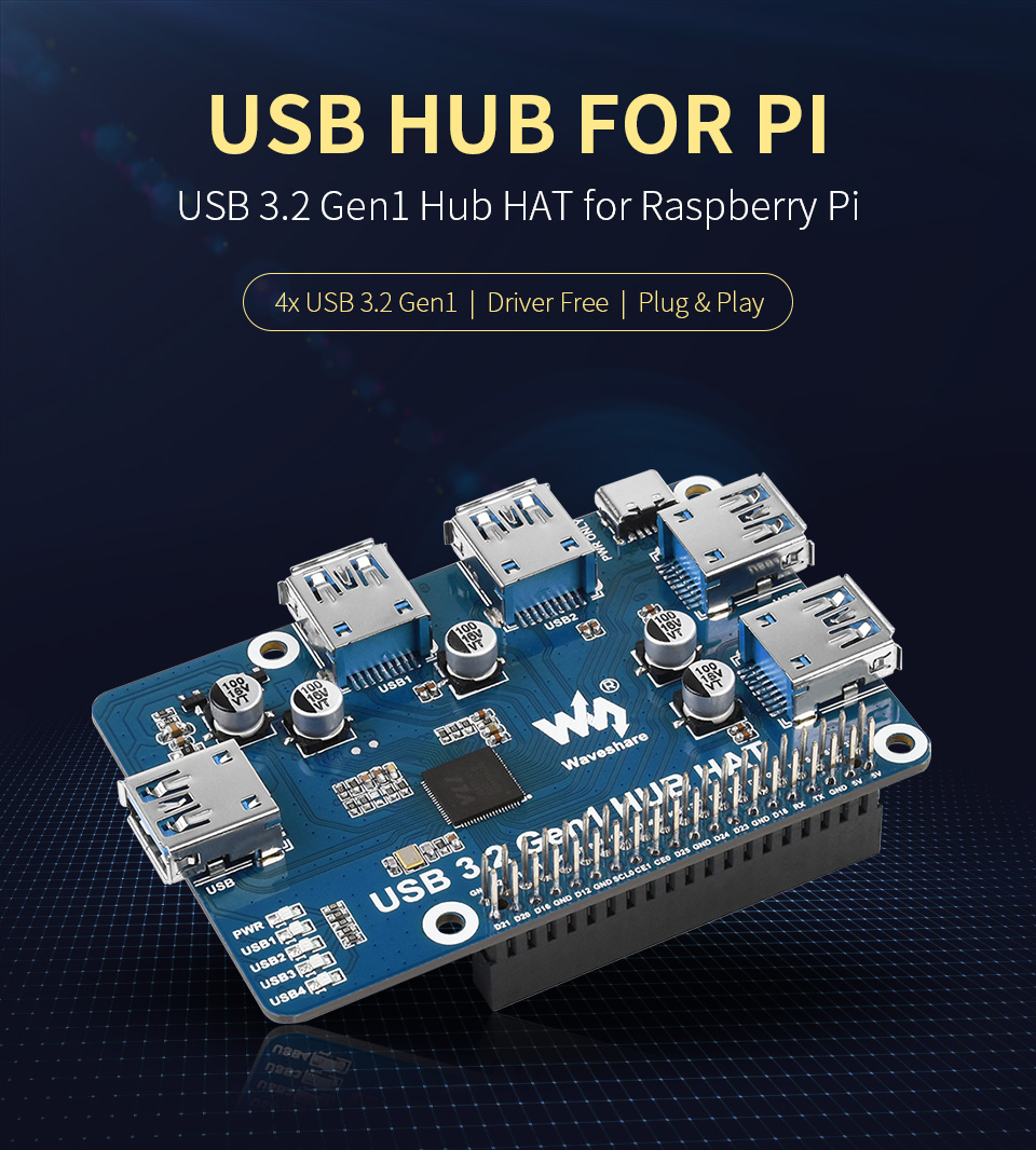 USB 3.2 Gen1 HUB HAT Raspberry Pi là bo mạch mở rộng lên tới 4 cổng USB 3.2 Gen1 dành cho Raspberry Pi, cắm và chạy không cần cài driver.
