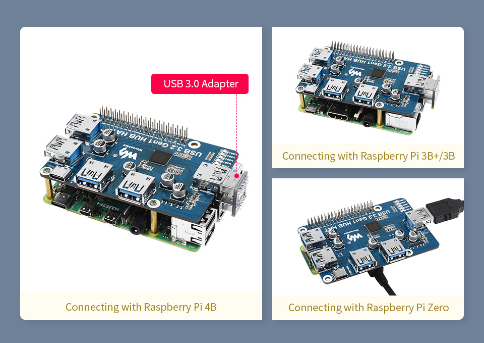 Lưu ý: Hiện tại chỉ có Raspberry Pi 4 và 400 Keyboard Computer hỗ trợ USB 3.0. Mặc dù mạch mở rộng có thể hoạt động với các bo mạch Pi phiên bản cũ hơn nhưng hiệu năng sẽ bị giảm do kết nối qua USB 2.0
