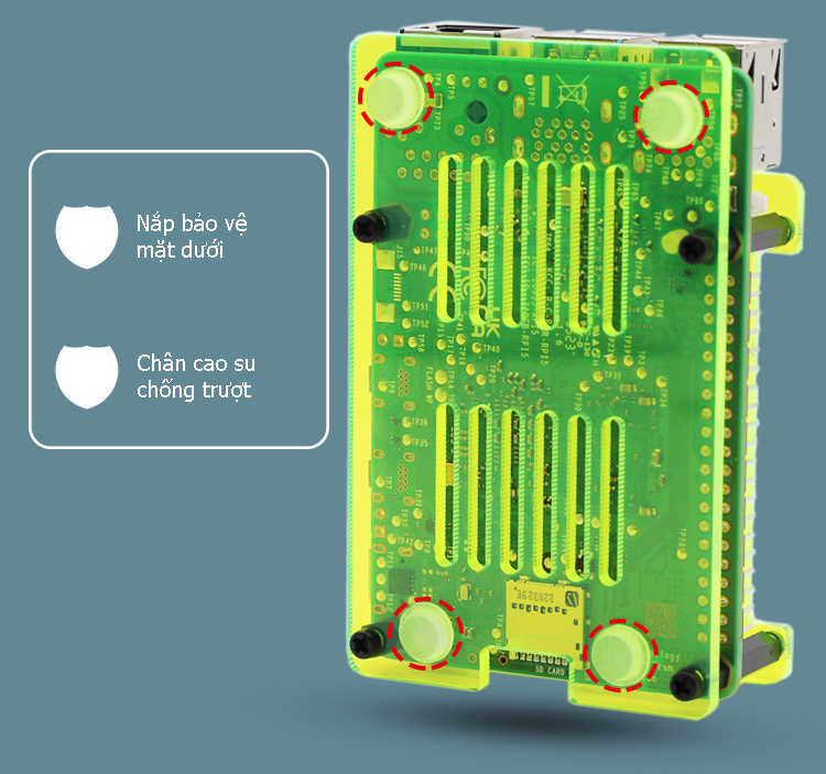 Bên cạnh đó, mặt dưới của vỏ case được trang bị 4 chân đế cao su giúp bo mạch không bị trượt khi để trên các bề mặt phẳng và trơn.
