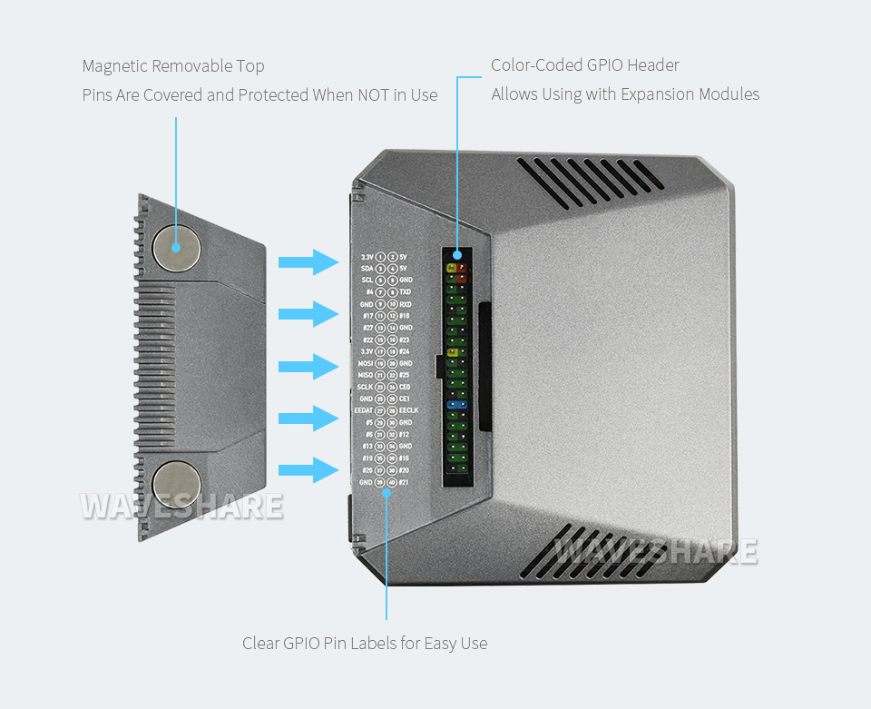 Cụm chân GPIO được bảo vệ bởi 1 nắp có gắn nam châm giúp bạn dễ dàng tháo lắp. Các chân GPIO được dán nhãn và đánh dấu với màu sắc nổi bật