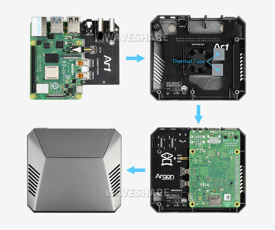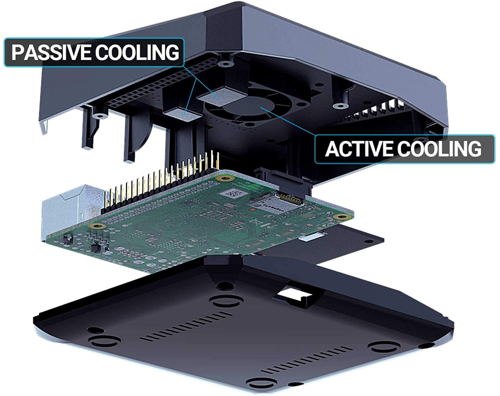 Toàn bộ nắp trên của vỏ máy hoạt động như một tấm tản nhiệt lớn làm mát thụ động cho Raspberry Pi nhờ chất liệu nhôm. Kết hợp với quạt làm mát đi kèm mang lại hiệu quả làm mát tuyệt vời.