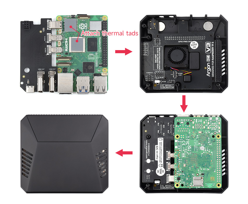 Vỏ nhôm Argon ONE V3 đã được nâng cấp để tương thích với Raspberry Pi 5, nổi bật với lớp sơn bóng màu đen và các tính năng nâng cao. Hệ thống làm mát chủ động có thêm quạt PWM 30mm có thể lập trình, được thay đổi vị trí bên trong vỏ để hoạt động yên tĩnh hơn. Khả năng làm mát thụ động được cải tiến hơn nữa với việc bổ sung tản nhiệt trên chip quản lý năng lượng của Raspberry Pi 5, bổ sung tản nhiệt cho CPU để giải quyết các mối lo ngại về nhiệt tiềm ẩn trong quá trình sử dụng chuyên sâu.
