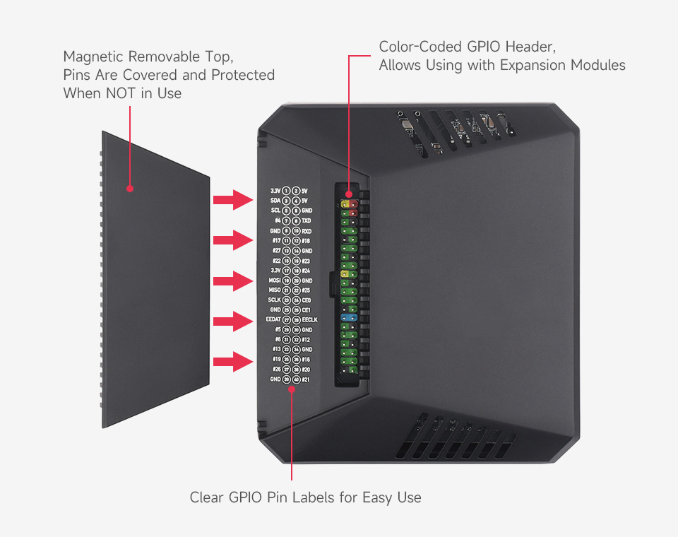 - Các tính năng thiết kế đẹp mắt: Vỏ từ tính để dễ dàng truy cập, các chân GPIO được mã hóa màu và bộ thu IR tích hợp để sử dụng với điều khiển từ xa Argon IR.