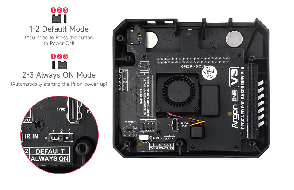 Raspberry Pi 5 được hưởng lợi từ việc cải thiện khả năng giao tiếp và quản lý năng lượng thông qua chip RP2040 của Raspberry Pi, chip này điều khiển các tính năng và chức năng khác nhau của Argon ONE V3. Nút nguồn ở phía sau hỗ trợ chức năng linh hoạt, bao gồm tắt máy an toàn, khởi động lại và bắt buộc phải tắt máy nhờ tập lệnh nguồn mở. Tập lệnh này cho phép người dùng tùy chỉnh các hành động liên quan đến nguồn điện của Argon ONE V3, chẳng hạn như khởi động thủ công hoặc tự động sau khi mất điện bằng cách đặt các chân nhảy bên trong vỏ.
